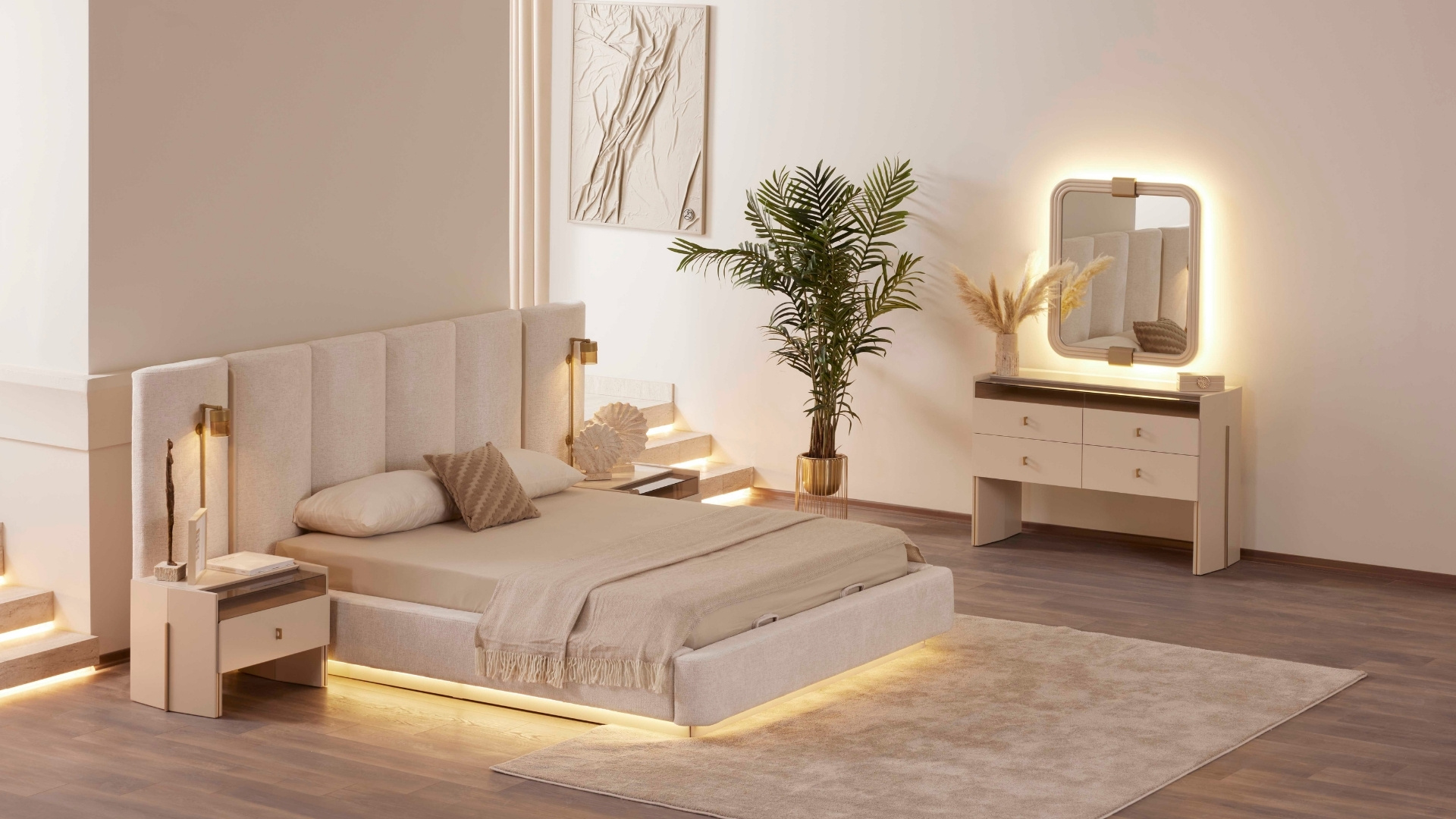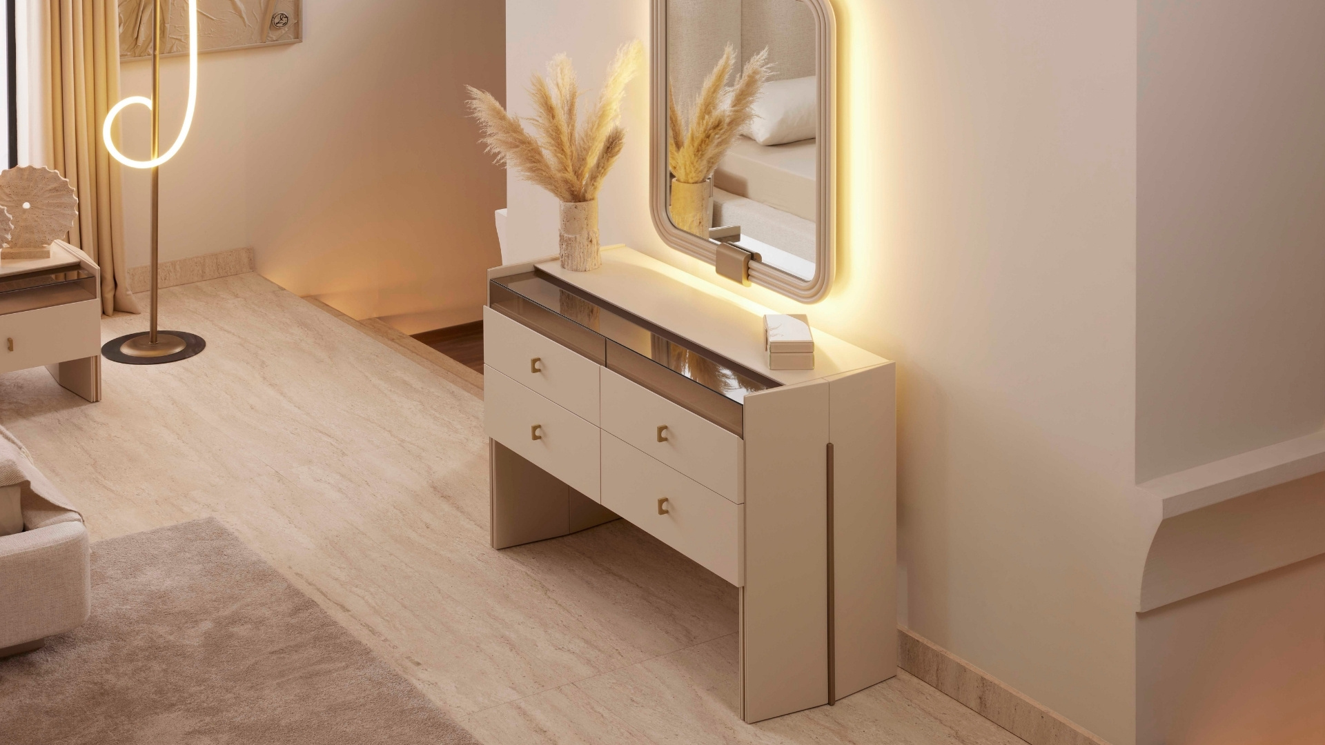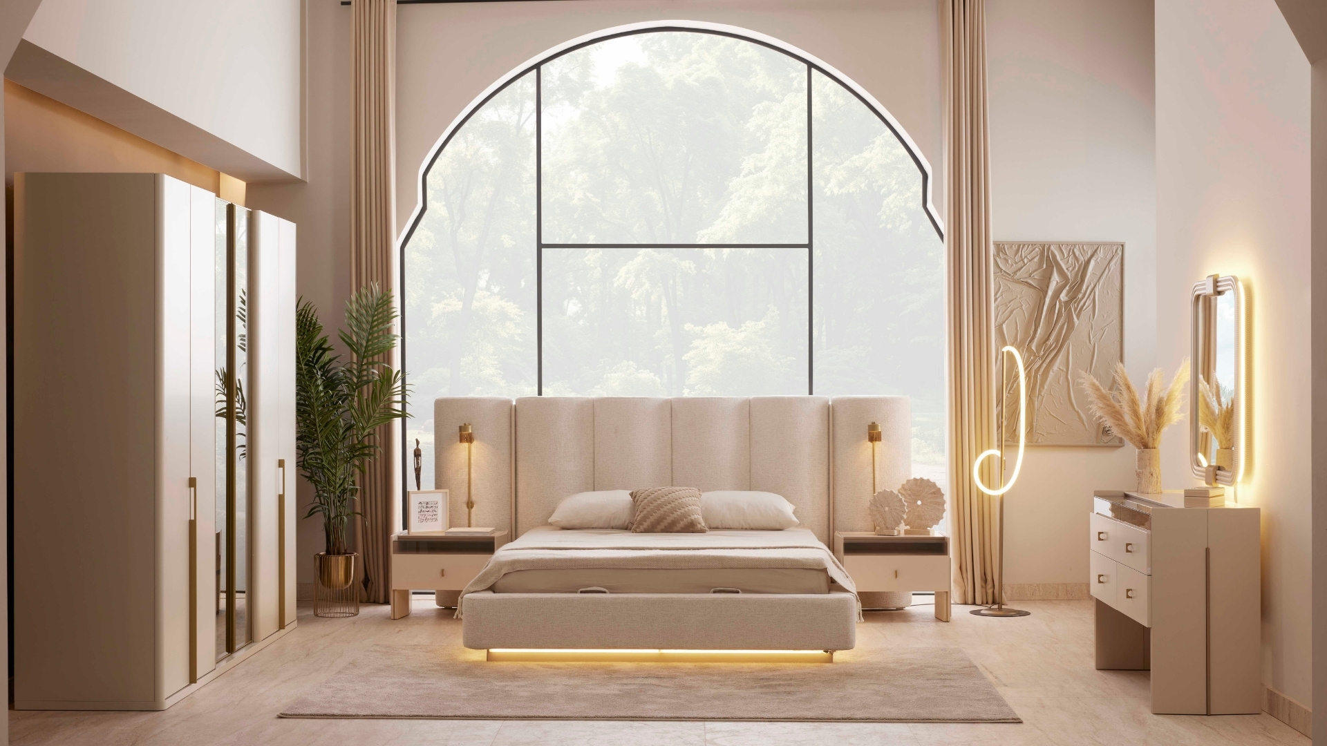 Modern mimarinin geniş perspektifinden ilham alan Yatak Odası, sadeliği zarafetle birleştiriyor. Yüksek tavanlar, büyük pencere biçimleri ve açık tonlu dokular, ferah, huzurlu ve dengeli bir atmosfer yaratıyor. Konforlu bir yaşam alanı tasarlamak için her detay özenle düşünülmüştür