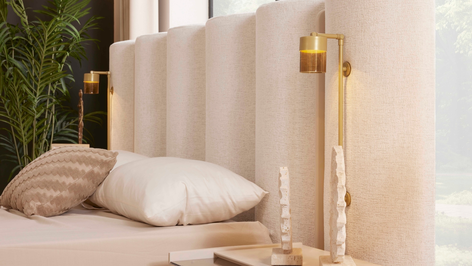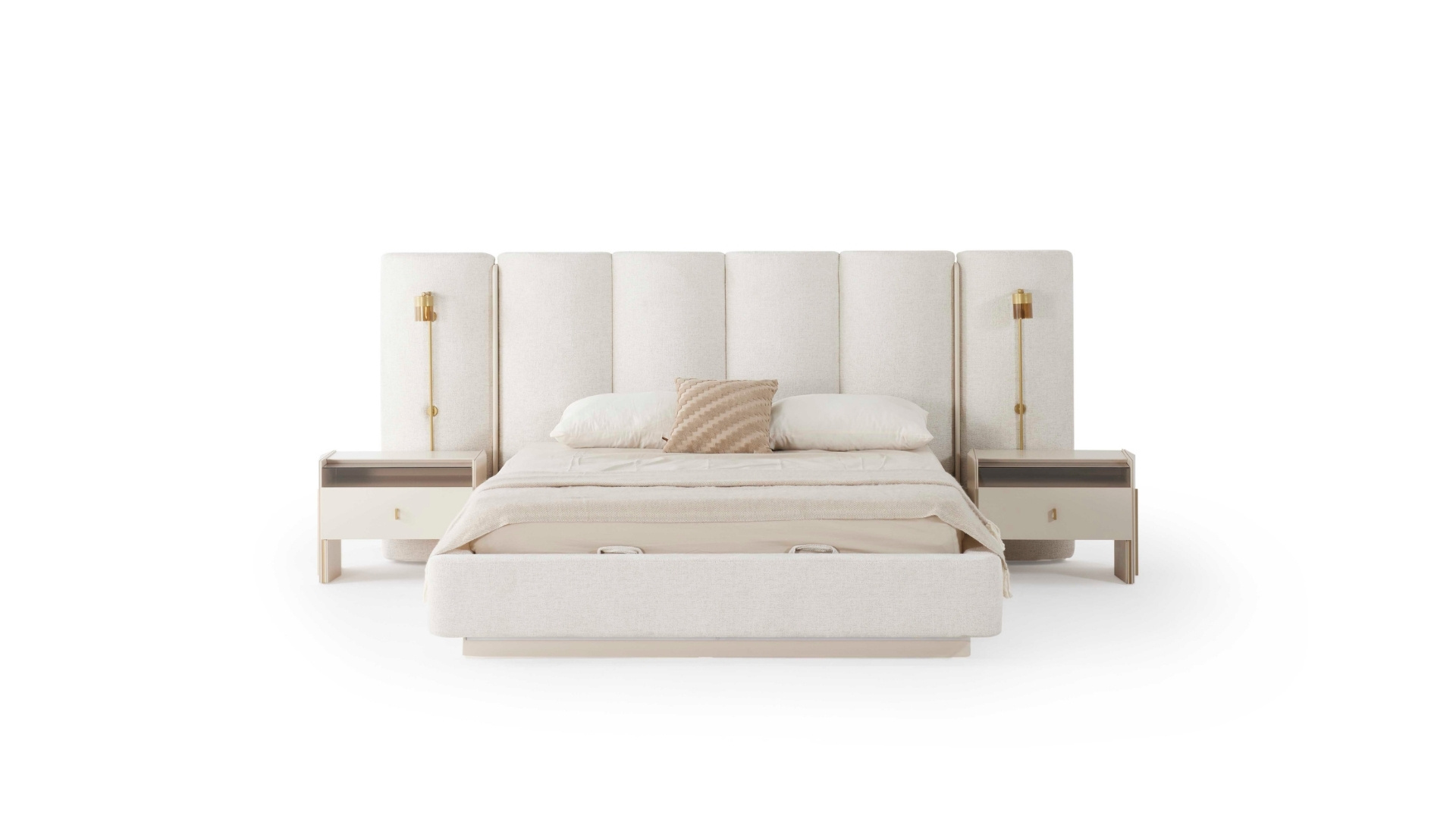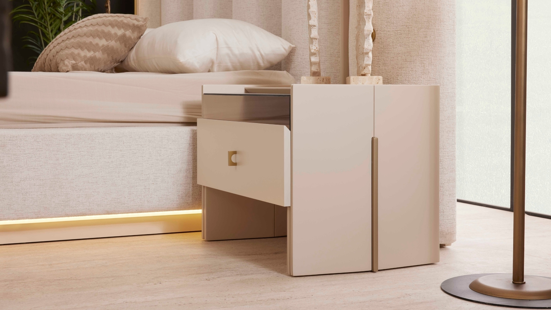Modern mimarinin geniş perspektifinden ilham alan Yatak Odası, sadeliği zarafetle birleştiriyor. Yüksek tavanlar, büyük pencere biçimleri ve açık tonlu dokular, ferah, huzurlu ve dengeli bir atmosfer yaratıyor. Konforlu bir yaşam alanı tasarlamak için her detay özenle düşünülmüştür