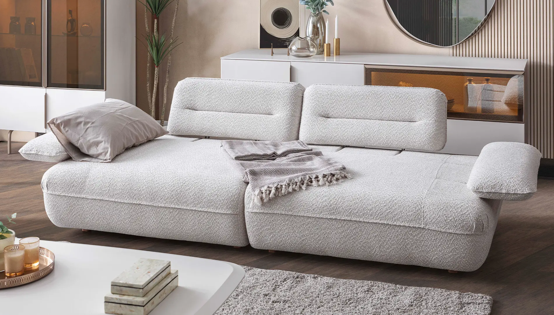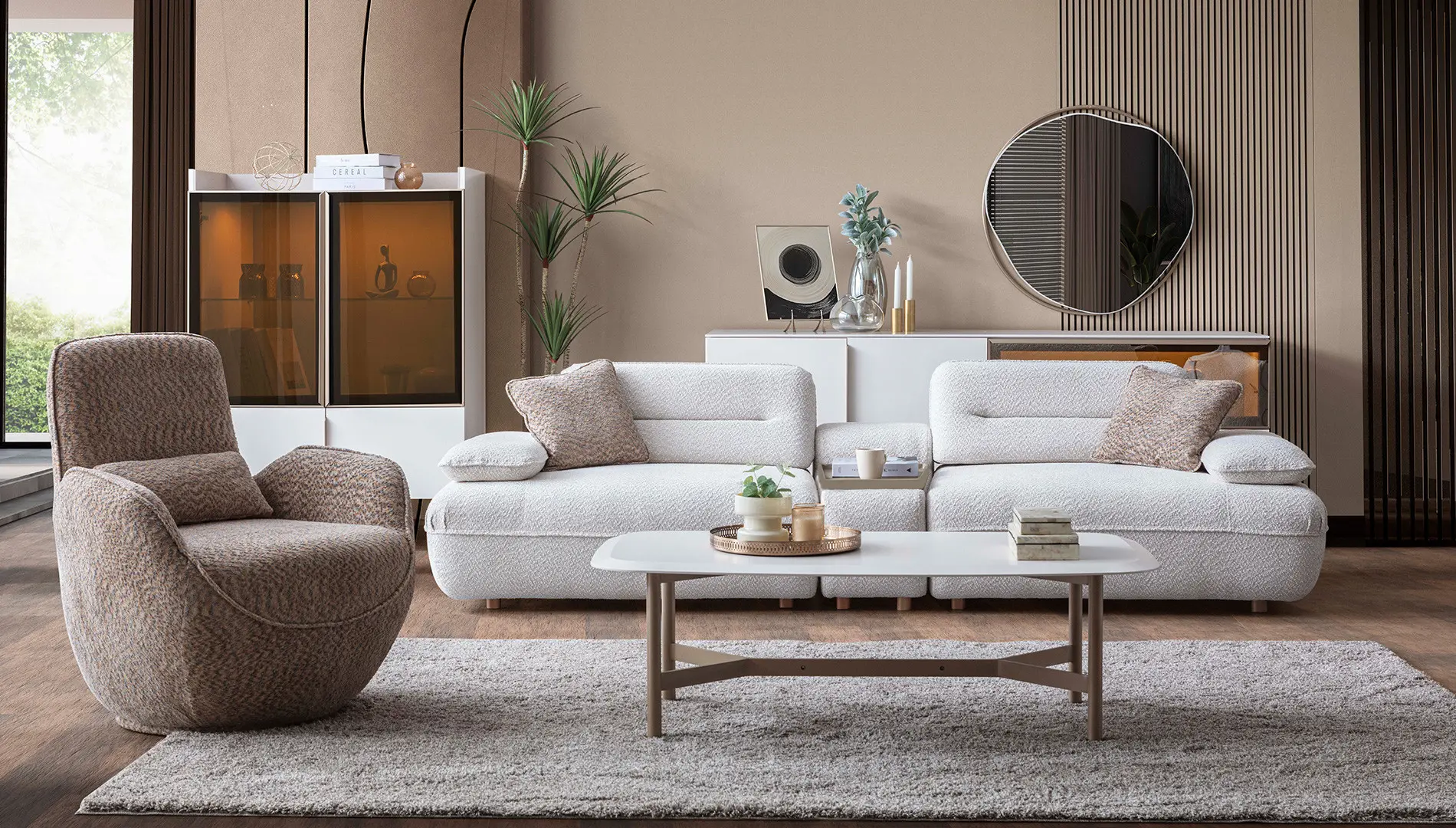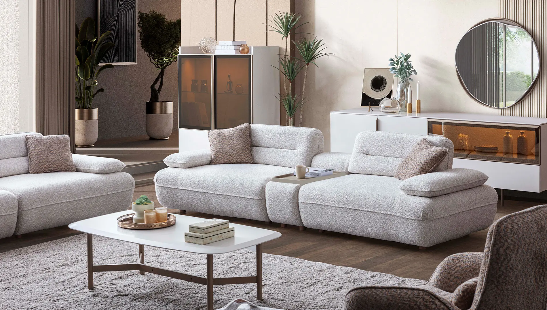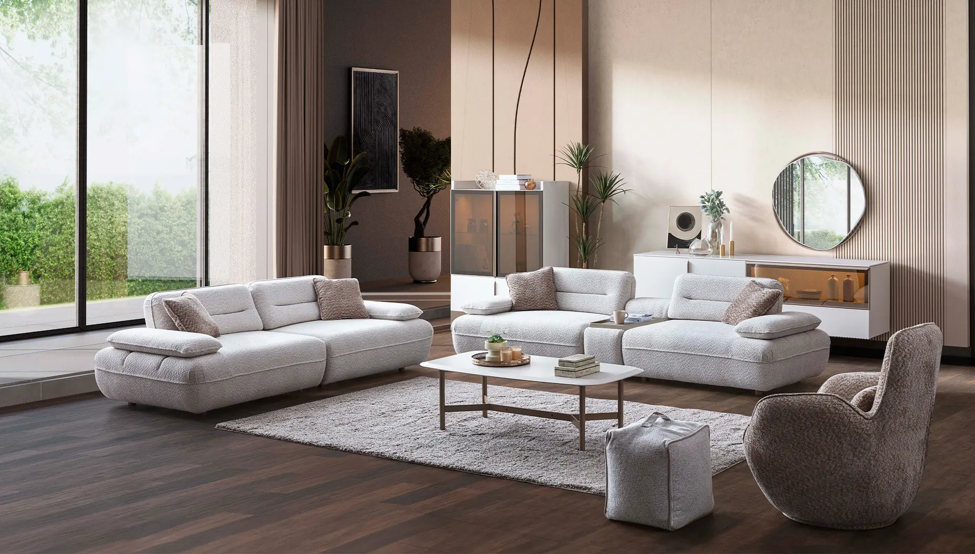 Modulera Koltuk Takımı, nötr renklerin sadeliğini minimal tasarım detayları ile birleştirerek; her beğeniye hitap edecek bir stil yansıtıyor.